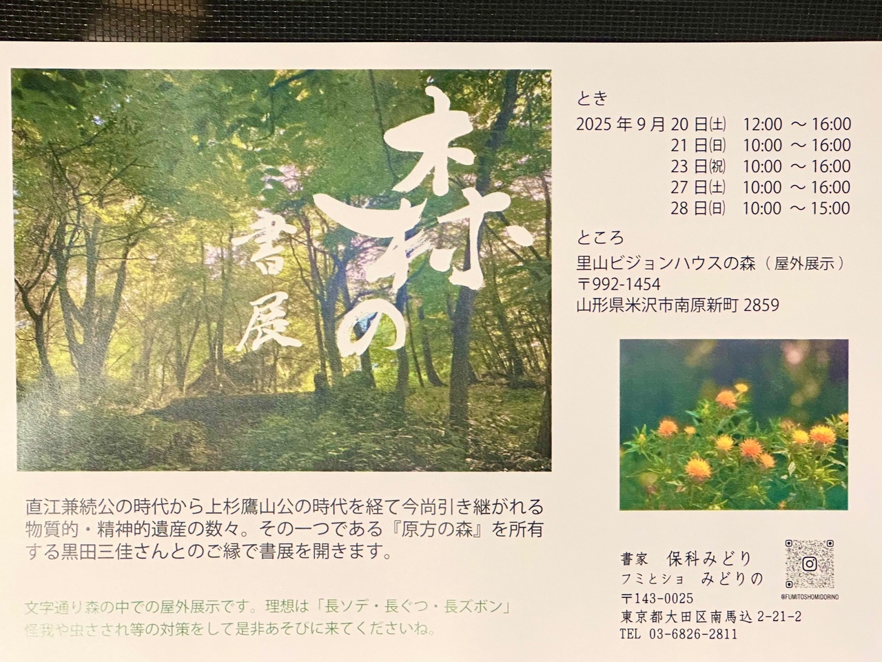 Home 新着情報 書家保科みどりさんとコラボイベントを行いました。 書家保科みどりさんとコラボイベントを行いました。 2025.10.29 新着情報 里山ソムリエとのコラボイベントを行いました。 書家保科みどりさんが森にて書の展示をしてくださいました。 当日展示した書は、現在屋内に展示いたしております。 Post Share Hatena Pocket RSS feedly Pin it コメントは利用できません。